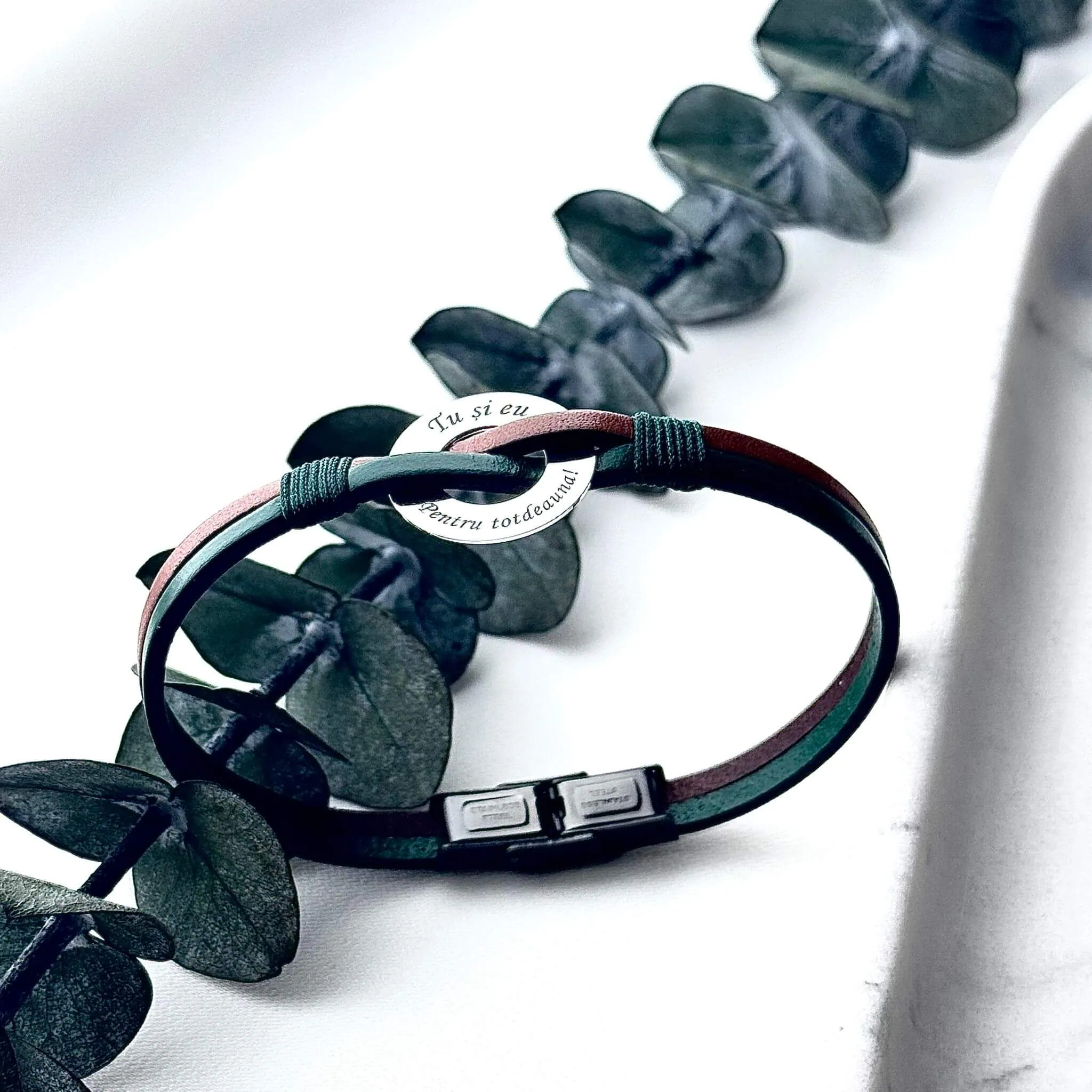 Comanda Bratara bicolora fixa din piele si Disc Argint si adauga un accesoriu elegant si personalizat colectiei tale! Discul personalizat poate fi gravat cu orice text doresti, de la numele tau sau al celui drag pana la o fraza sau o data importanta.