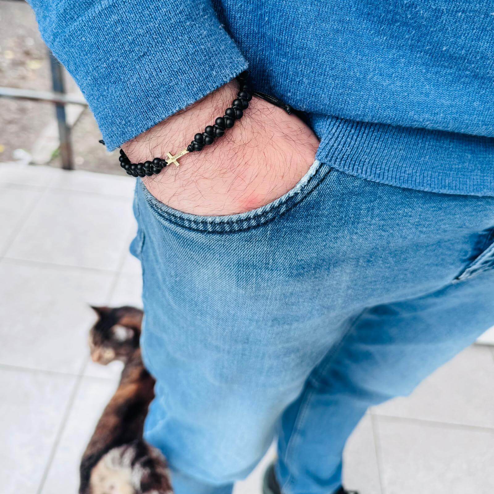 Brățară cu Onix Natural și Cruce din Aur 14K, simbol de protecție și credință