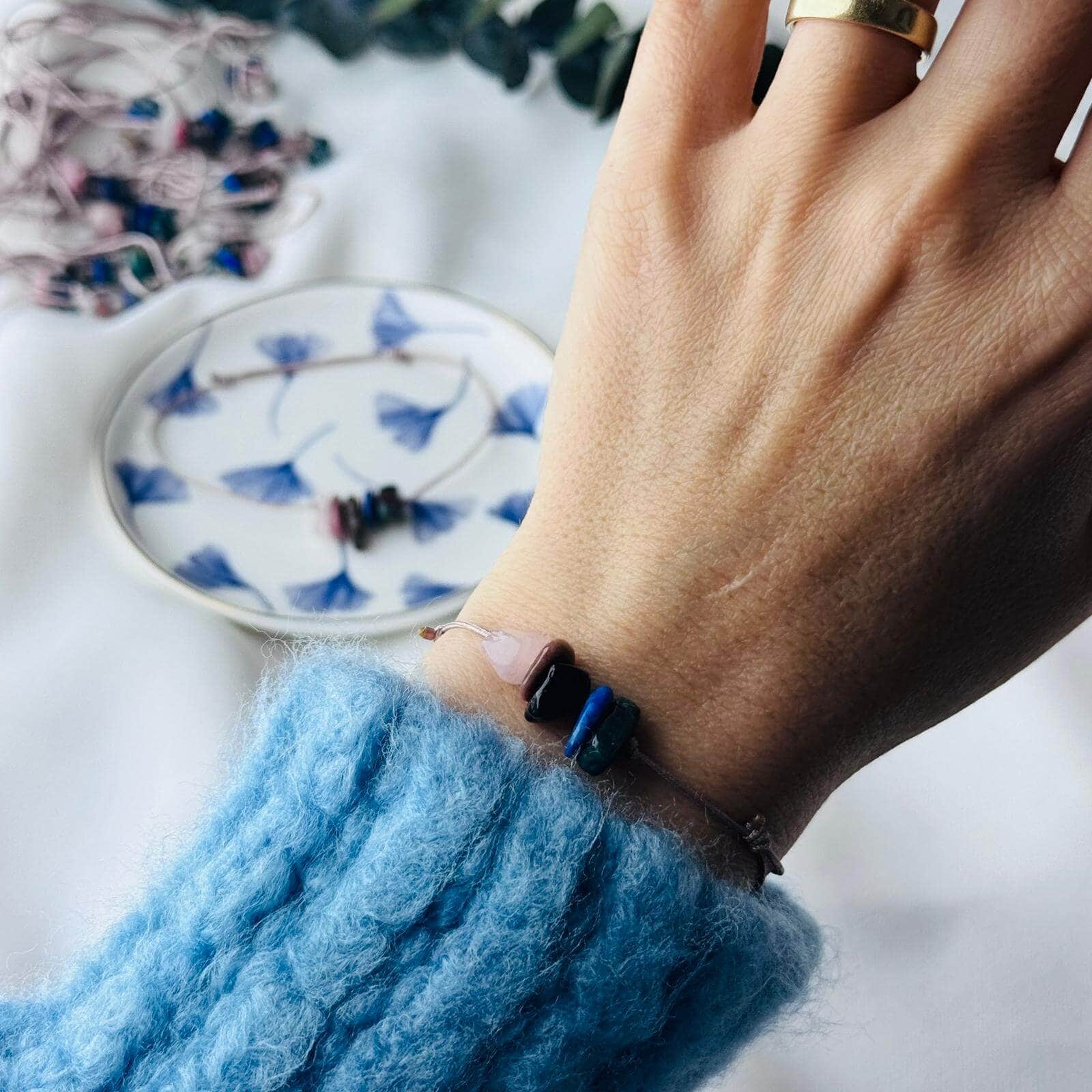 Brățară dedicată zodiei Capricorn, realizată pe șnur reglabil și îmbogățită cu pietre semiprețioase atent alese: cuarț roz, rodonit, cuarț fumuriu, lapis lazuli și agate moss. Un talisman pentru echilibru emoțional, claritate, protecție și stabilitate.