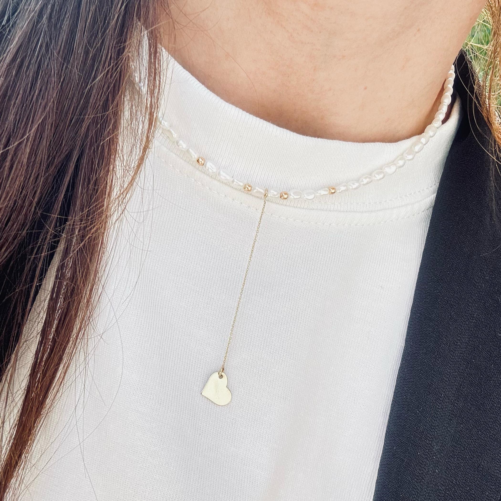 Ideal pentru a sublinia rafinamentul și stilul personal, accesoriul nostru – Colier cu perle cultura alb, bob neregulat si pandantiv inima Aur este potrivit pentru orice ocazie specială sau pentru a aduce o notă de glamour în viața de zi cu zi.