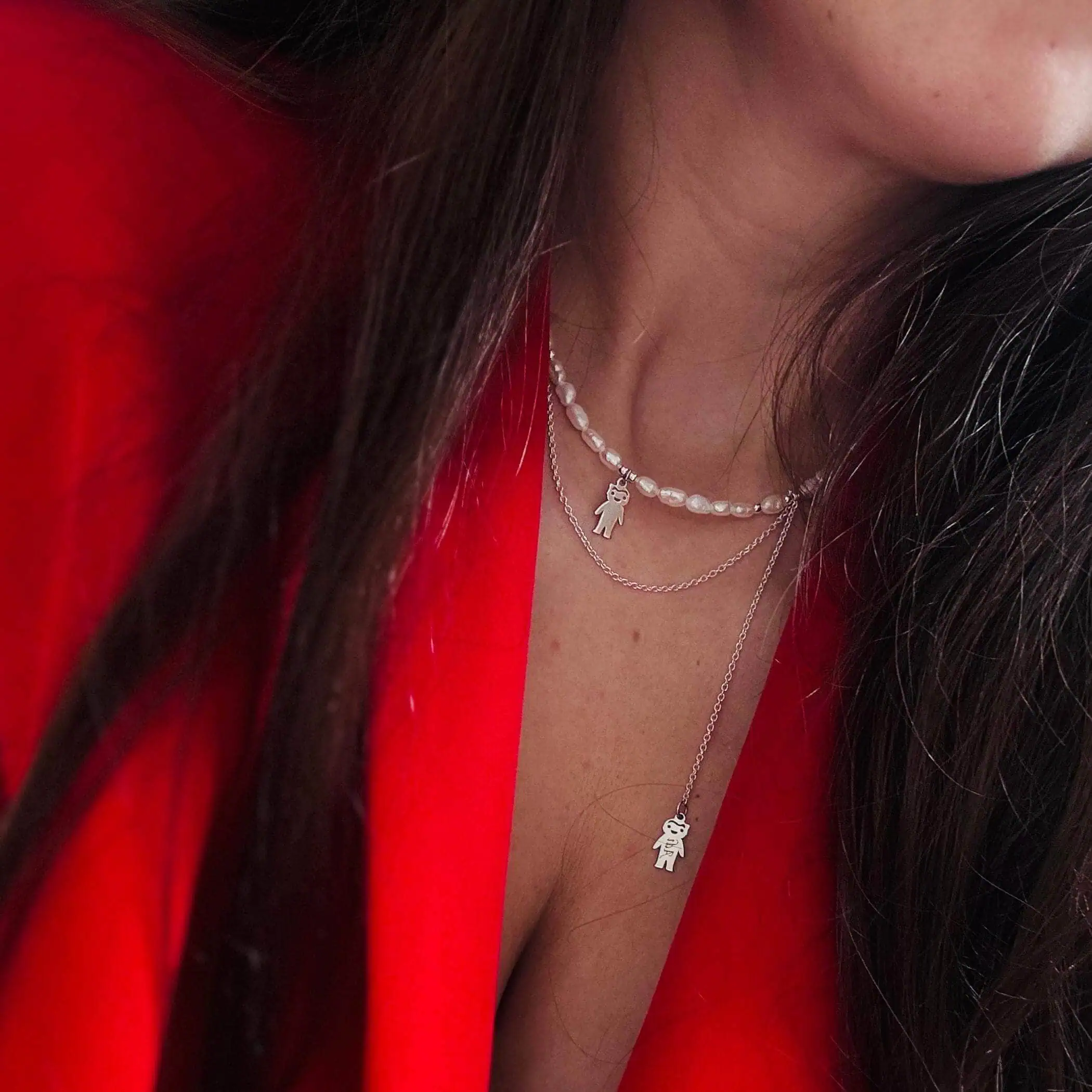 Un colier care spune o poveste. Creat din perle de cultură naturale și elemente fine din argint 925, această bijuterie delicată este pusă în valoare de două figurine personalizate – simboluri ale celor dragi sau ale unei legături de neînlocuit.